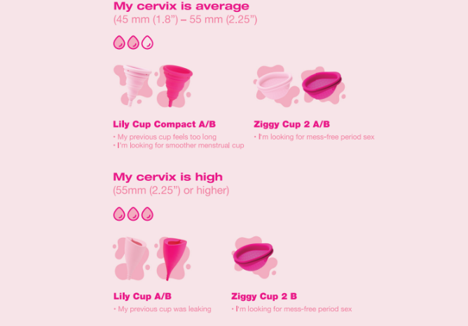 - Heavy flow: Lily Cup B or Ziggy Cup 2 B.