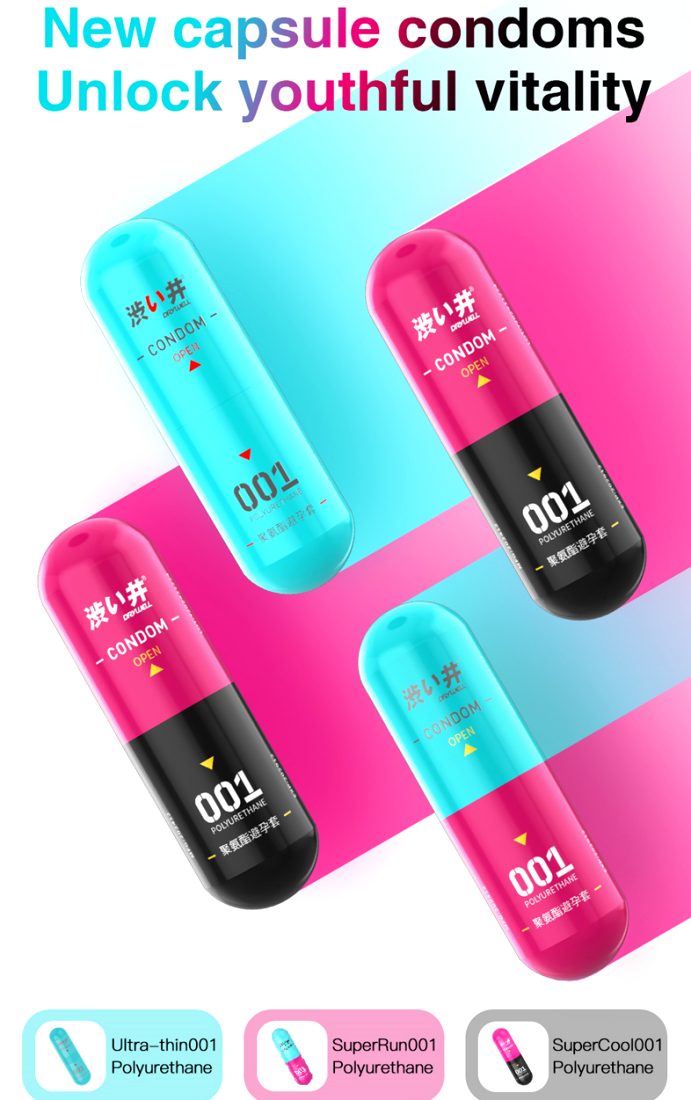 Polyurethane material, youthful and trendy capsule design, portable and easy to open, quick effect, high elasticity, non greasy, ultra-thin fit.