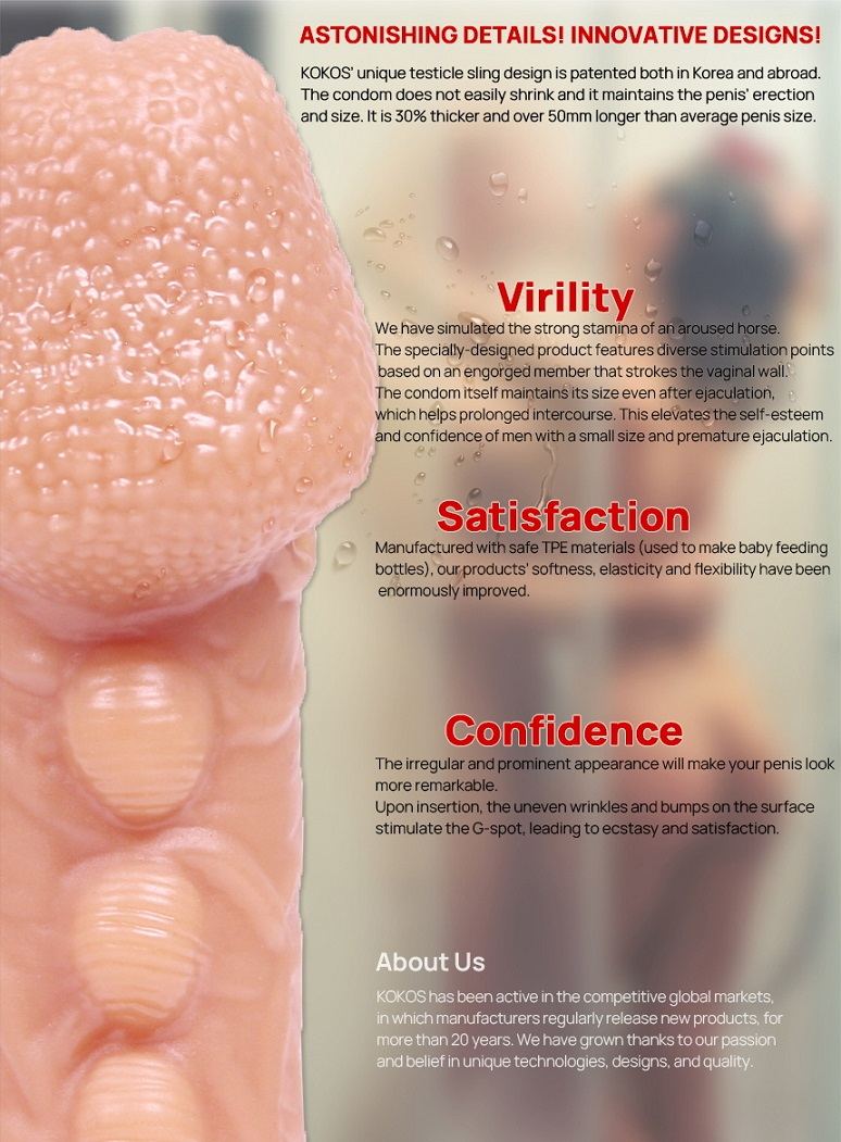 KOKOS' unique testicle sling design is patented both in Korea and abroad. The condom does not easily shrink and it maintains the penis' erection and size. It is 30% thicker and over 50mm longer than average penis size.