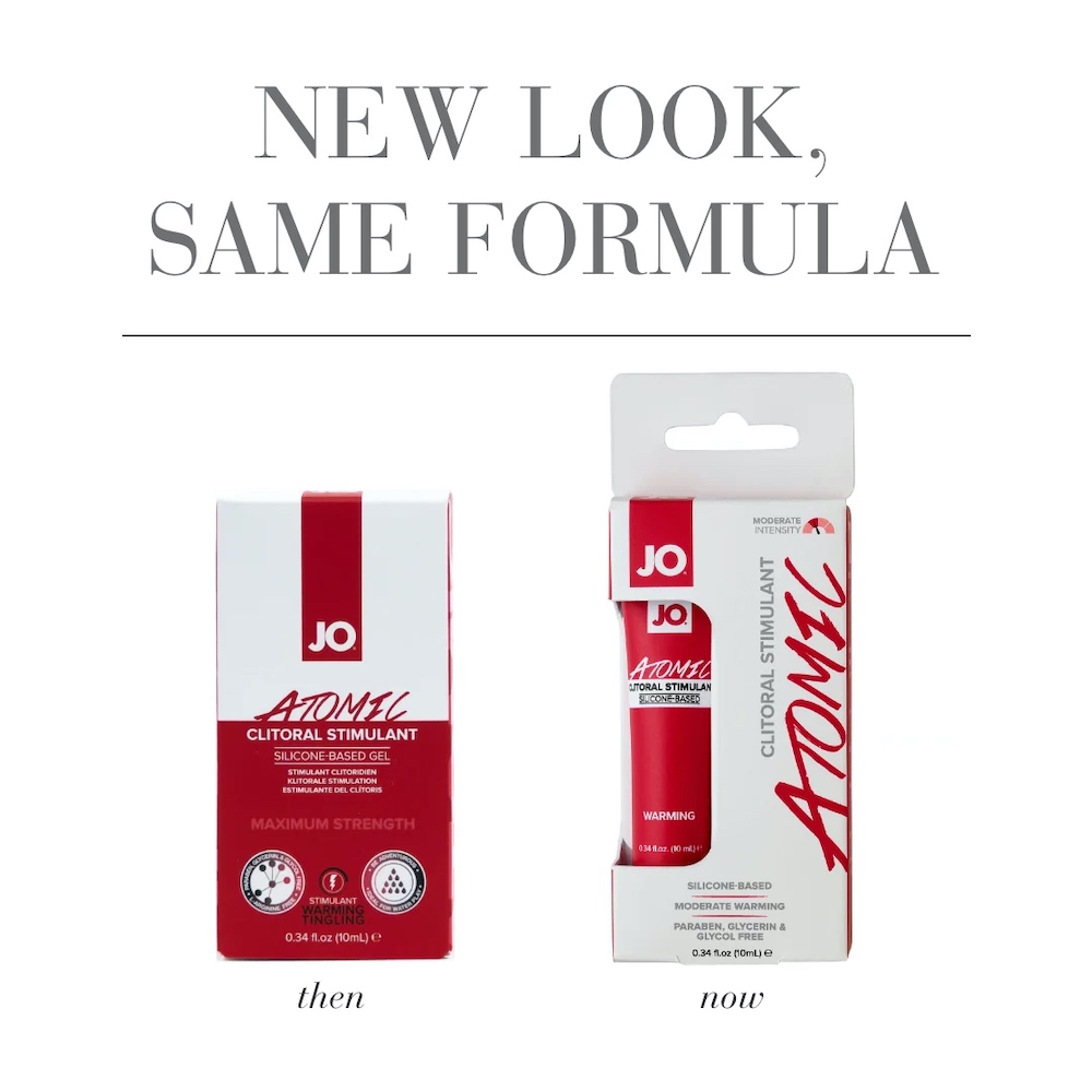 JO® ATOMIC are silicone-based clitoral stimulant formulated to heighten sensual pleasure with a thrilling topical warming sensation. Designed to enhance touch sensation and sensitivity during foreplay and soloplay; regular and maximum strength formulas available. JO® ATOMIC & JO® SPICY offer a silky smooth, lasting glide made of high quality silicone free of preservatives, and water resistant for more adventurous use.