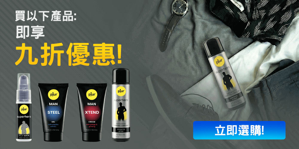 Pjur 男士润滑系列亦推出九折优惠,送礼自用皆宜!Concentrated Delay Serum 减低敏感度同时不麻痹,助您化身耐力型英雄;Energizing Glide 提升表现与活力;Steel Gel 带来强劲按摩感;Xtend Cream 有助肌肤长效护理与血液循环,全面提升感受。